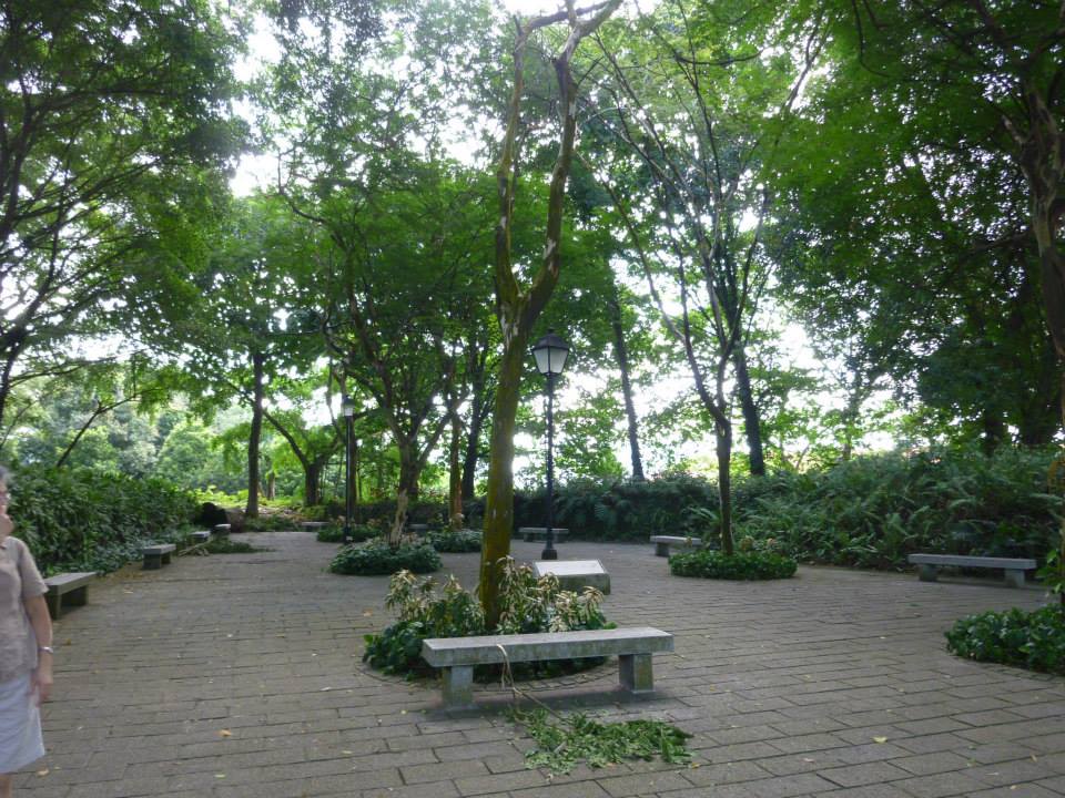 維維安哈韓,在百勝樓樓下的韓國零食店買零食送同學。最角落頭的海南雞飯店早就沒做了吧,畢竟已經過了十幾二士年再次到訪。維維安買零食當兒,我坐在外面的石椅上瀏覽表姐列印的地圖,找出通往 Fort Canning Park 的路線。這個公園面積很大,因為不知道從前拍拖的地點叫什麼,找起來相當吃力,只能找有城堡門的部份,最後選擇走 Bencoolen Street 接 Fort Canning Road 走到 Hotel Fort Canning,其間爬了三大階段的樓梯。以為我們要找的是 Fort Wall,到了發現不像,再對照公園內的路線圖,猜想可能是 Mural Wall,往前走時看到廁所的標誌,就按指示方向前進先上廁所,結果往下面的一大片草地一看,那不是嵌著墓碑的牆壁嗎?終於找到了!那時已在公園內停停走走了一小時。